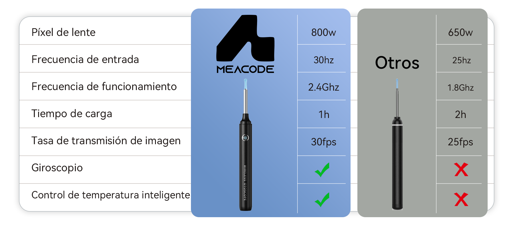 Equipado con un potente chip Wi-Fi, Meacode logra una transmisión de video en tiempo real sin demoras. Cada uno de tus pequeños movimientos se encuentra con una respuesta inmediata y precisa, asegurando que veas con claridad y actúes con precisión para eliminar por completo el riesgo de "limpieza a ciegas".